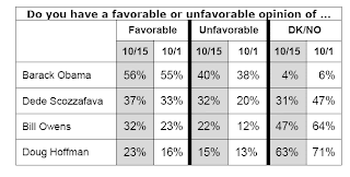 For a district that traditionally leans right and has higher GOP registrations to have increased favorability for Obama seems highly unlikely in a poll of likely voters. The district voted for Obama by the same margin by which he was elected nationally. The poll results are quite a bit more favorable to Obama than Rasmussen's polling shows as well. Also support for Scozzafava is fading but support for Owens, even with a likely skewed poll shows support for him is soft: